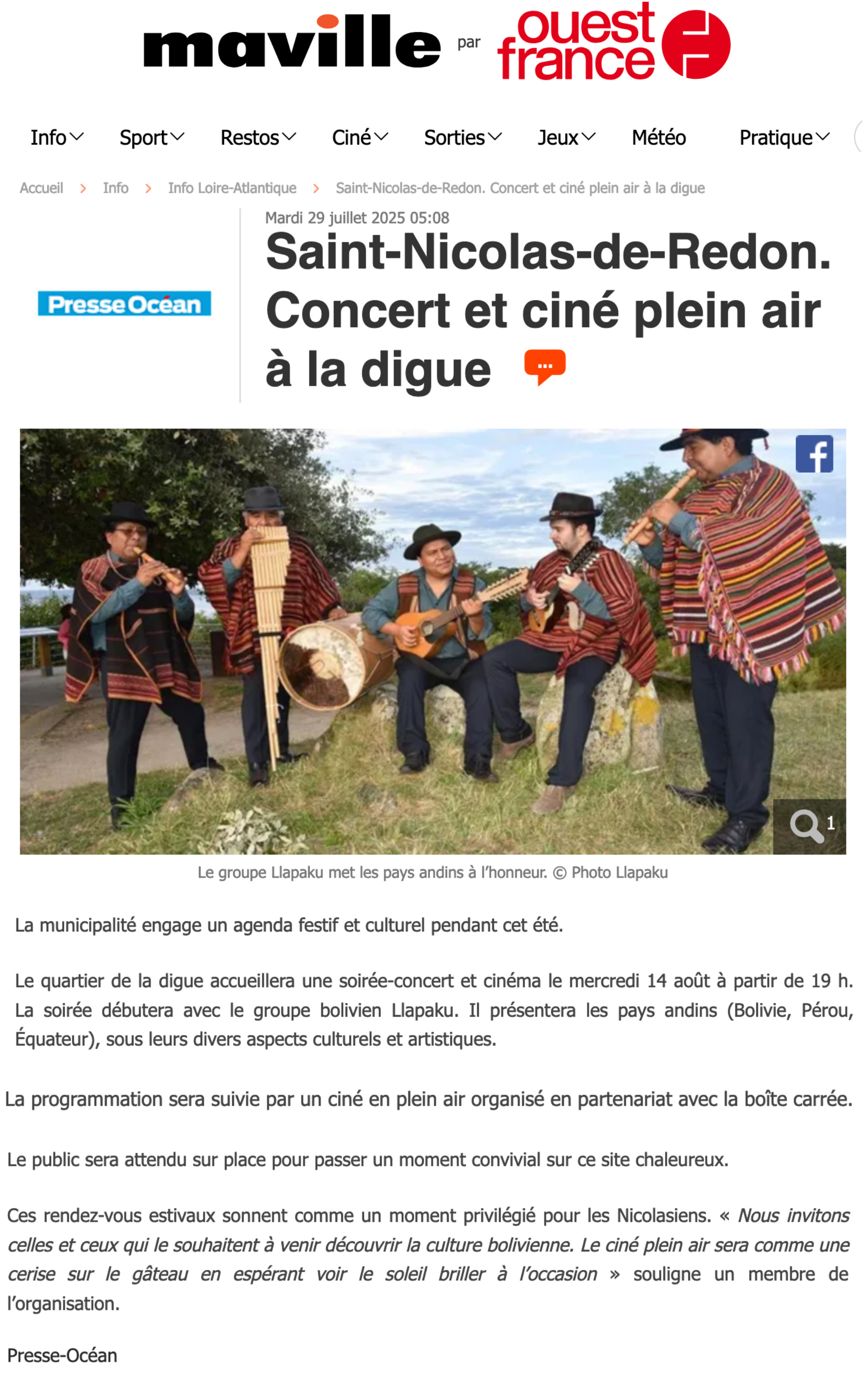 Concert de clôture du festival Mer et Vie Près de 500 spectateurs étaient invités avec le groupe bolivien Llapaku à voyager sur la Cordillière des Andes longeant le Lac Titikaka, à rêver à la culture des indiens, la fête du soleil, chez les Incas et voler au-dessus de l'Amérique du sud en compagnie du Condor et de la Colombe Blanche. Sous un tonnerre d'aplaudissement, les mélomanes se sont enflammés sur des rythmes endiablés. Le groupe Llapaku crée en 1990 est composé de quatre boliviens et d'un péruvien, il se produit sur tout le grand Ouest et donne des concerts dans toute l'Europe. German Tintaya responsable du groupe mentionne : "Nous avons voulu promouvoir notre culture de la musique en Europe, faire partager notre musique et chants traditionnels"